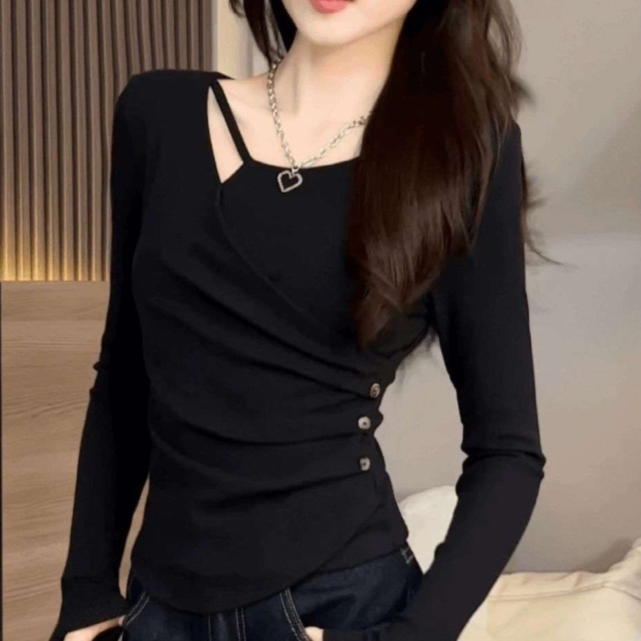 洗練されたアシンメトリーデザインが特徴的な韓国ファッションのリブニット。
