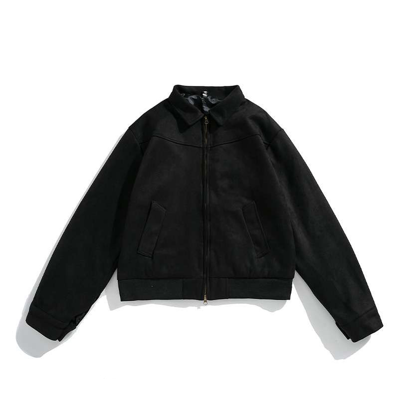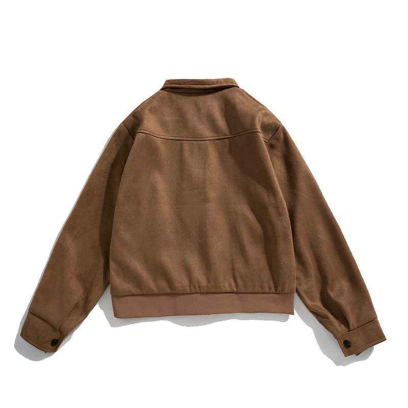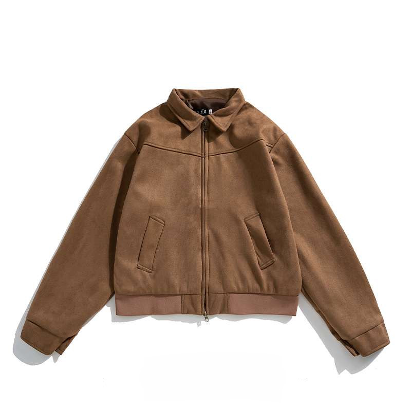 柔らかな質感のスエード素材を使用し、襟付きデザインが上品さを演出。