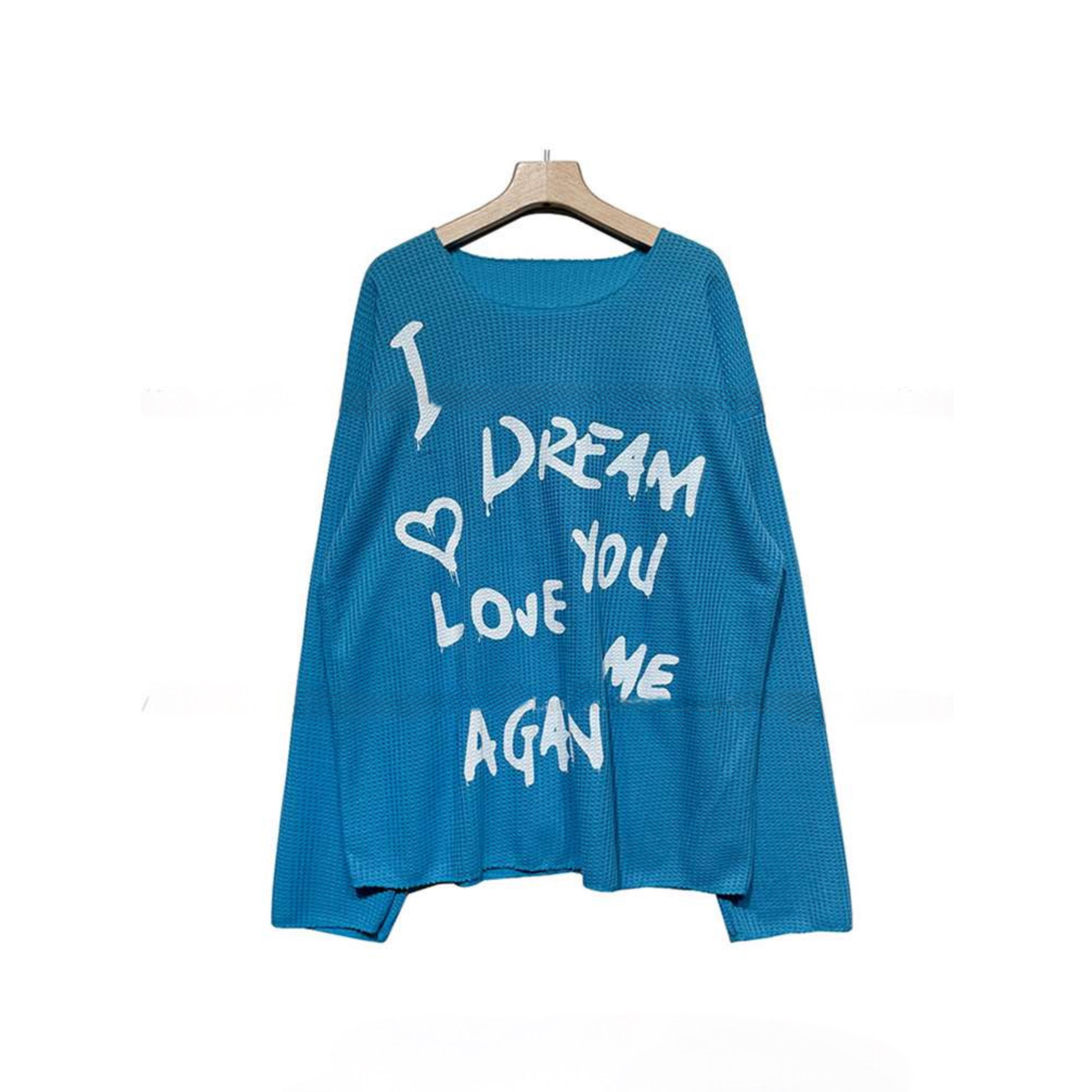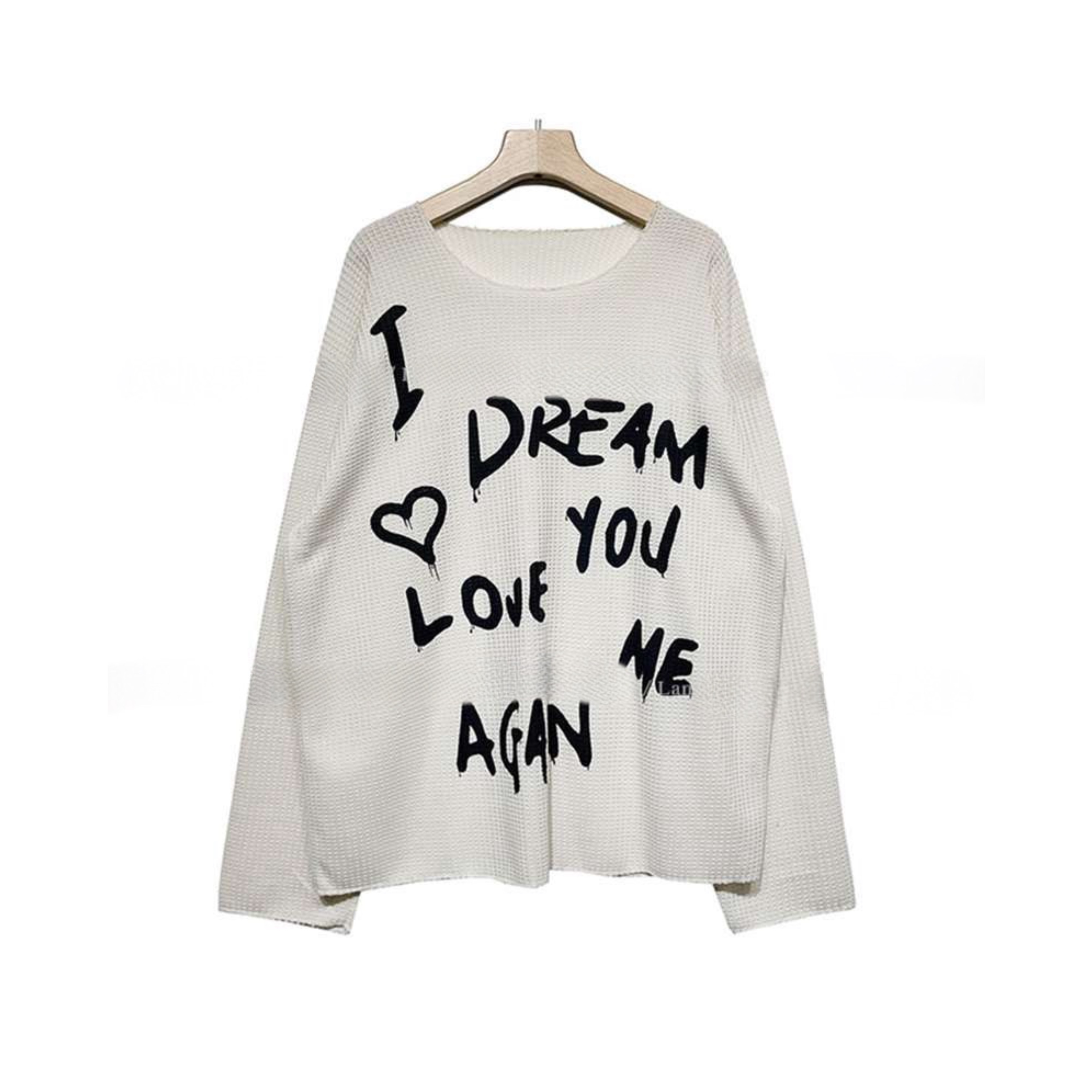 ゆったりシルエットの長袖デザインで、胸元のメッセージプリントが個性を引き立てます。