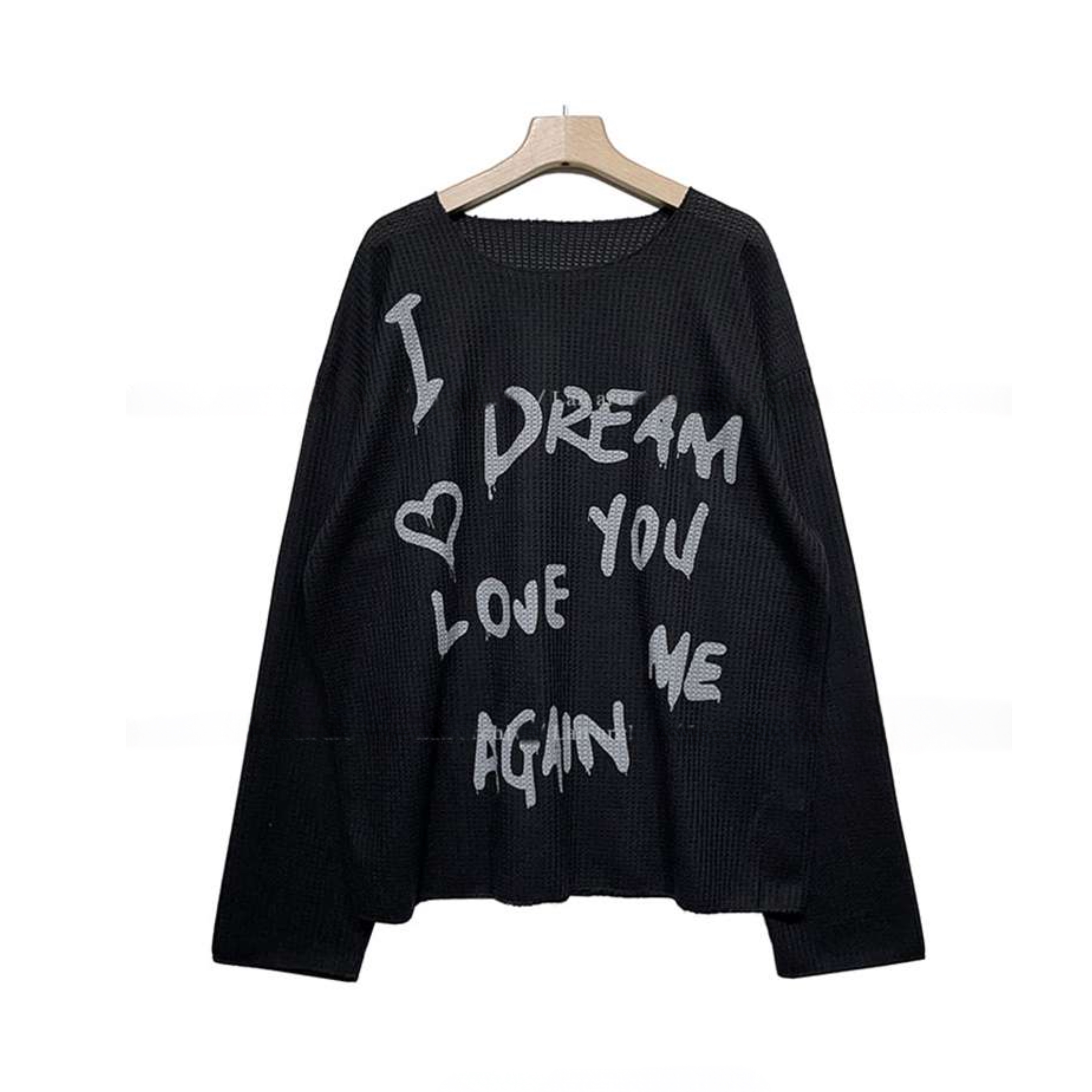 白いニットに黒字で大胆に描かれたのメッセージが目を引き、ストリートファッションの雰囲気を演出。