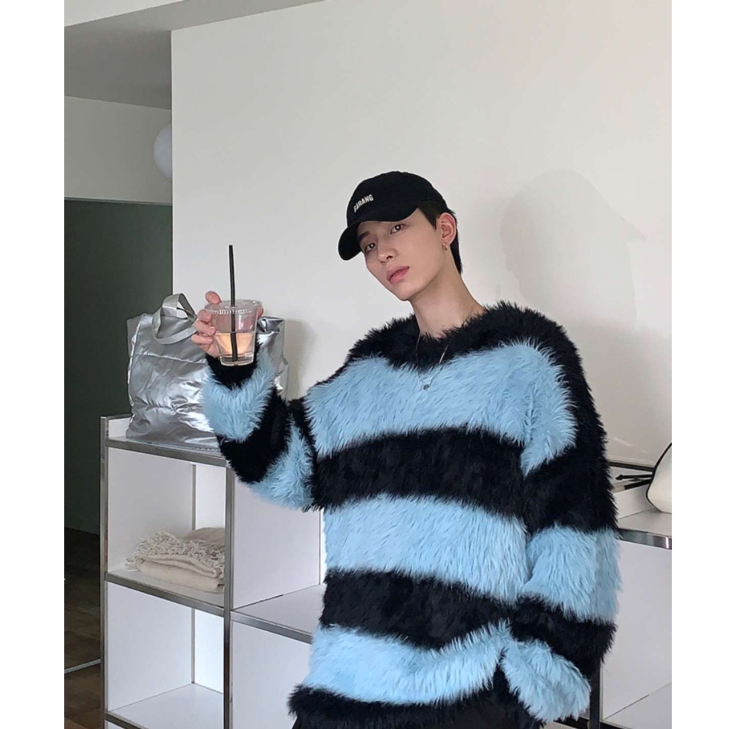 太めのストライプ模様と豊かな質感が韓国メンズファッションの最新トレンドを反映した、冬の着こなしを格上げする逸品です。